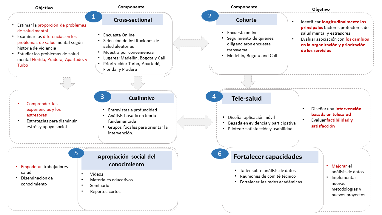 1) Estudio transversal deberá incluir al menos 2,984 trabajadores de la salud (personal clínico y no clínico, incluyendo personal administrativo y personal de apoyo) para estimar la prevalencia y distribución de los estresores de salud mental. El muestreo será a conveniencia a través de instituciones de salud, asociaciones médicas, hospitales y redes sociales. En el estudio transversal incluiremos además una muestra específica de los trabajadores de la salud de Florida, Pradera, Apartado y Turbo (n=150) y compararemos las proporciones de problemas de salud mental a nivel nacional con los datos específicos de estas regiones. 2) Estudio de cohorte: Incluirá a los trabajadores de la salud de las ciudades de Bogotá, Medellín y Cali. Se les hará seguimiento a los 3, 6, y 12 meses de la primera medición para conocer los impactos de la pandemia a largo plazo y cómo los factores estresores y protectores explican un mayor o menor riesgo de enfermar. La información recolectada en la línea base de este estudio cohorte se incluirá también en el estudio transversal descrito en el primer componente. 3) Diseño y evaluación de una intervención basada en eHealth que permita detectar y prevenir depresión y ansiedad, y promover la resiliencia en los trabajadores de la salud. 4) Componente de apropiación social del conocimiento que incluya estrategias de diseminación de los resultados de la investigación y la intervención eHealth para prevención de problemas de salud mental en trabajadores de la salud. Para promover la salud mental de los trabajadores de la salud, se diseñará material educativo en vídeos e infográficos y foros con la presentación de los resultados, así como el diseño de informes cortos a tomadores de decisiones. 5) Construcción de capacidades: estrategias de transferencia de conocimiento en la colaboración con la London School of Hygiene and Tropical Medicine. 6) Componente cualitativito: estudio basado en teoría fundamentada. Se llevarán entre 25 – 30 entrevistas a profundidad para comprender la percepción de los trabajadores de la salud, miedos y factores protectores (soporte social y medios para disminuir el estrés). Llevaremos a cabo grupos focales para diseñar y co-producir la intervención basada en eHealth y los materiales de esta. Realizaremos tres grupos de enfoque orientados al diseño, cada uno de 6-8 trabajadores de la salud, reclutados en diferentes entornos de atención médica. Este componente también se usará durante el pilotaje de la intervención para comprender las experiencias de los participantes sobre el uso de la intervención de eHealth. 6) Estudio cualitativo basado en la teoría fundamentada. Se realizarán 25-30 entrevistas con trabajadores de la salud, específicamente médicos, enfermeras y auxiliares de enfermería.